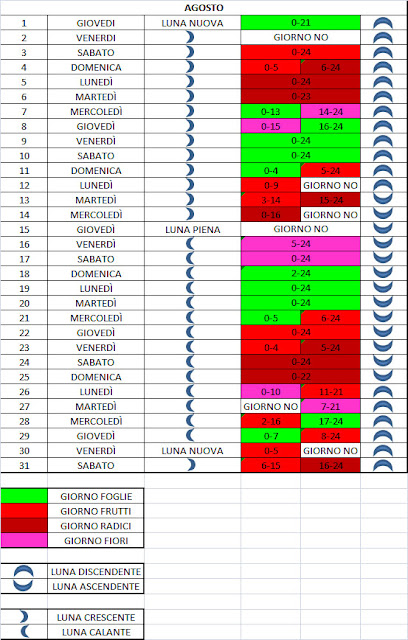 AGOSTO: umido, coperto e caldo, ma comunque non piove…. Così si presentava Agosto nella famosa regola dei dodici giorni. Ma se una volta forse funzionava, se guardo i mesi appena passati, non funziona più, sarà per colpa dei mutamenti climatici ma qui bisogna guardare le previsioni ufficiali che diventano sempre più precise ed esatte. Comunque sia ho comperato i broccoli, i cavolini di bruxelles, il cavolo nero e la verza viola che pianterò domani pomeriggio così da iniziare Agosto con tutto piantato nell’orto. Continueremo a fare i mercati settimanali durante tutto il mese mentre invece Villa Garagnani a Zola si fermerà i primi quindici giorni. Ad Agosto bisognerà anche iniziare a fare alcune potature, vedremo come si svilupperà il clima e agirò di conseguenza. Chissà se quest’anno riusciremo a fare il sambuco; sono tre anni che non fa bacche buone per la confettura !!!